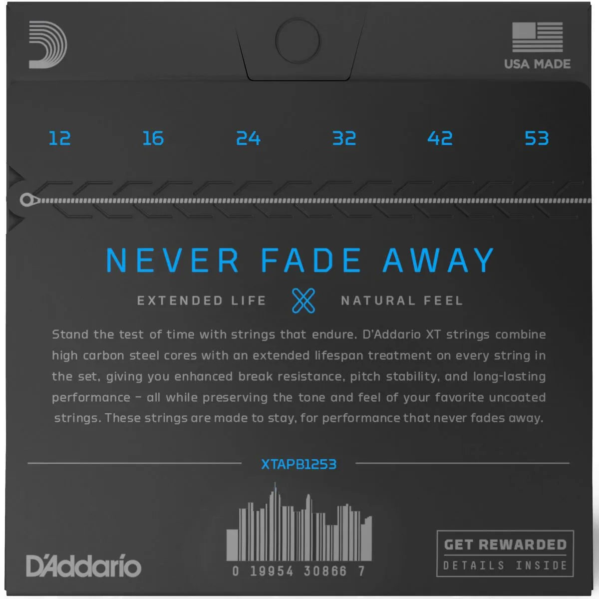 D'Addario XT, Acoustic Guitar 6 String Set, Light Gauge (.012, .016, .024, .032, .042, .053), Phosphor Bronze Round Winding, Steel Hexagonal Core, D'Addario Item XTAPB1253.