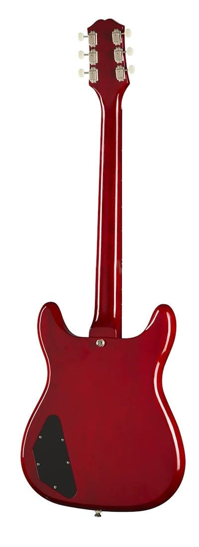 The Crestwood first appeared in 1958 and in slightly modified form in 1959 as the Crestwood Custom; it was Epiphone's first original solid body electric guitar design. The new Epiphone Crestwood Custom returns to its roots with features that harken back to the early models including a symmetrical double cutaway mahogany body with two Epiphone PRO Mini Humbucker pickups, three on a side reduced sized Kalamazoo headstock with Epiphone Bikini badge and ivory button Epiphone Deluxe tuning machines, and a clear butterfly pickguard with white center stripe and foil E logo. The Crestwood Custom comes equipped with a glued-in mahogany neck with a medium C profile, Indian laurel fretboard with 12" radius, 22 medium jumbo frets and Epiphone oval inlays, 2 volume and 2 tone controls with CTS potentiometers and an Epiphone LockTone Tune-O-Matic bridge with Graph Tech TUSQ saddles and Tremtone vibrato tailpiece. Pickguard blemish.