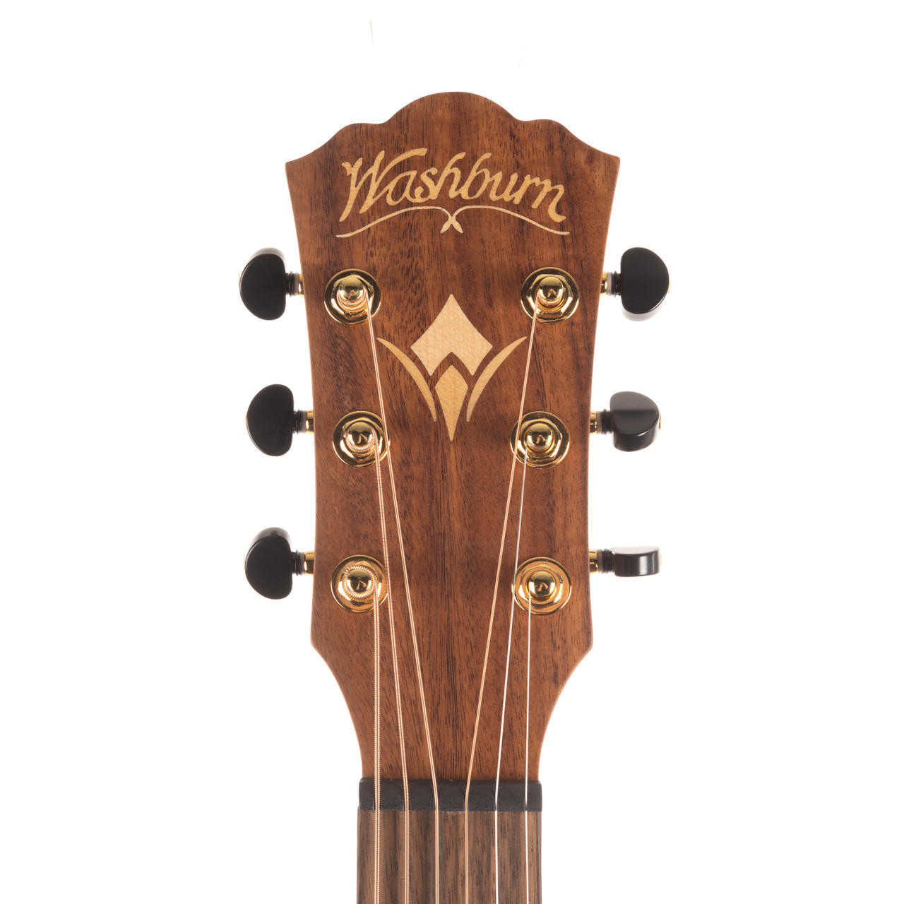 The WCGM55K is a ¾ size, satin finished, mini grand auditorium style acoustic guitar with a Koa top, back and sides. It feature Comfort Series appointments like a forearm rest consisting of a beveled strip of rosewood at the lower bout which becomes part of the rosewood top binding. A partial “Comfort” cutaway on the bottom upper bout allows superior access to the higher frets. The mahogany neck has a rosewood fingerboard with dot inlays which ties in nicely with the rosewood bridge. The rosewood capped headstock features a maple inlaid Washburn logo and stylized W as well as gold tuners with ebonite buttons. The gorgeous rosette is made of alternating maple and mahogany.